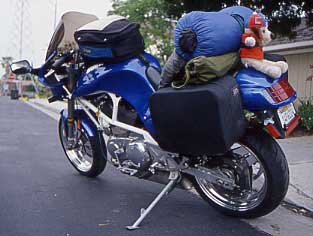 In this picture I was preparing for a one-month ride, camping along the way. The tank bag has my camera, maps, snacks, and other things I want several times each day. One saddlebag holds my tools and rain gear, the other has my clothes. Strapped to the seat are my tent, sleeping bag, and compact cot. (Stuffed dog mascot is optional, but kids in cars love it.) |